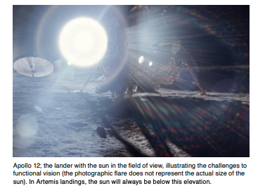 Humans are returning to the Moon—this time, to stay. Because our presence will be more permanent, NASA has selected a location that maximizes line-of-sight communication with Earth, solar visibility, and access to water ice: the Lunar South Pole (LSP). While the Sun is in the lunar sky more consistently at the poles, it never rises more than a few degrees above the horizon; in the target landing regions, the highest possible elevation is 7°. This presents a harsh lighting environment never experienced during the Apollo missions, or in fact, in any human spaceflight experience. The ambient lighting will severely affect the crews’ ability to see hazards and to perform simple work. This is because the human vision system, which despite having a high-dynamic range, cannot see well into bright light and cannot adapt quickly from bright to dark or vice versa. Functional vision is required to perform a variety of tasks, from simple tasks (e.g., walking, operating simple tools) through managing complex machines (e.g., lander elevator, rovers). Thus, the environment presents an engineering challenge to the Agency: one that must be widely understood before it can be effectively addressed.