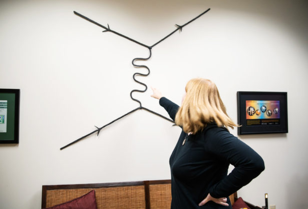 Conrad pointing to the Feynman Diagram sculpture that hangs on her office wall.