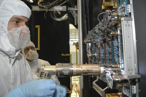 The pistol-grip tool slung on an astronaut's spacesuit as he works on the Hubble Space Telescope.