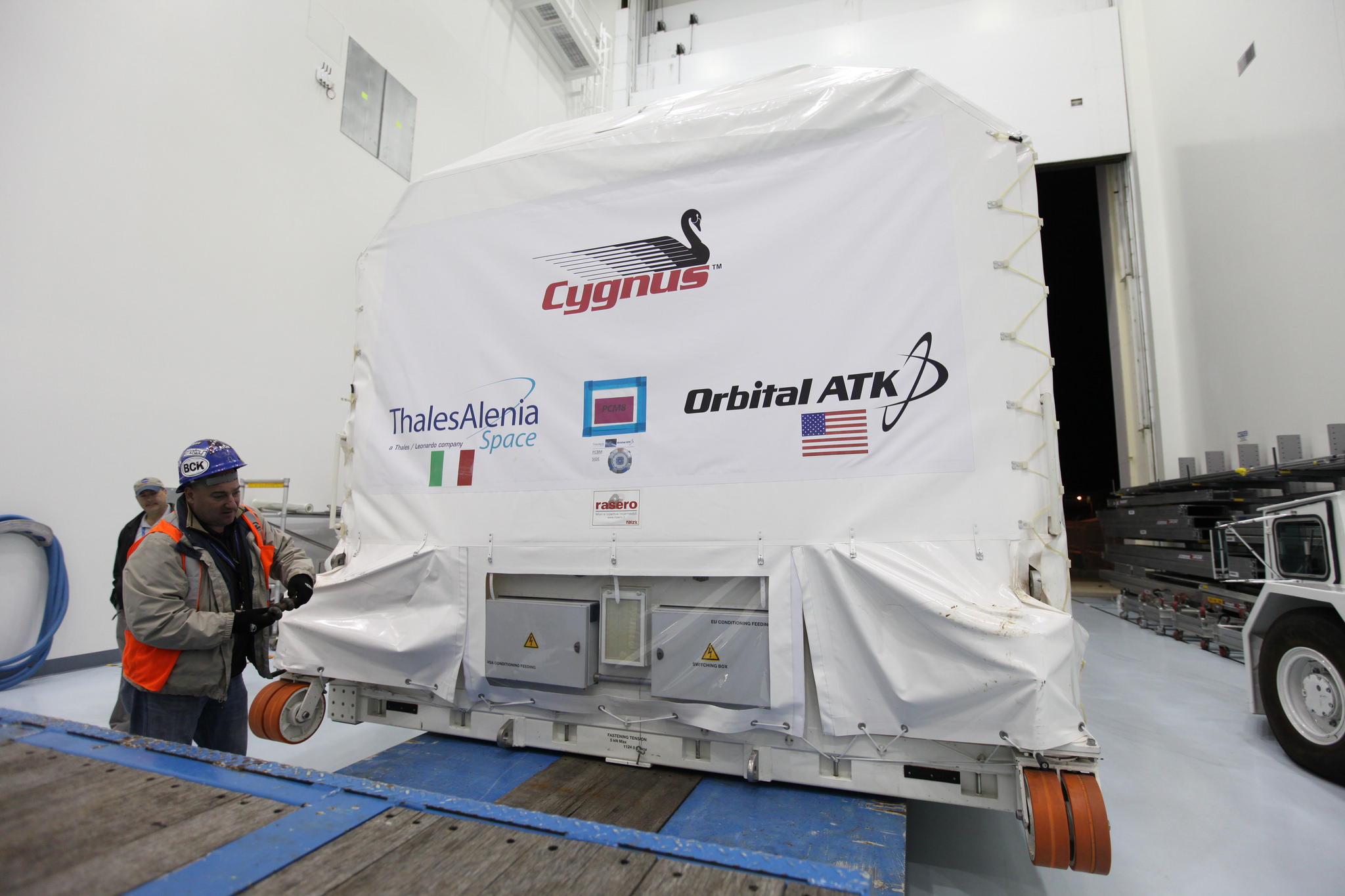 The Pressurized Cargo Module (PCM) of the Cygnus spacecraft has arrived at NASA’s Kennedy Space Center for processing and assembly before launch. The OA-7 mission is targeted to launch on Thursday, March 16 from Space Launch Complex 41 at Cape Canaveral Air Force Station in Florida.
